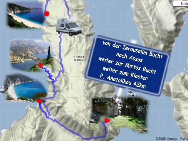 In Asos wandern wir zur Burg und auf der Rückseite zurück zu den Fahrzeugen, dann geht’s weiter an den Myrtos Strand. Durch den Sturm der letzten Tage treiben Schaumteppiche im Wasser, die nur teilweise durch die Sperre zurückgehalten werden. Heinz und Peter baden, Lisbeth und ich sammeln die schönen weißen Steine. Den Tag beenden wir am Klloster P. Anatolikou mit einer herrlichen Sicht bei Vollmond auf Ithaka – das uns nicht mehr ganz unbekannt ist.