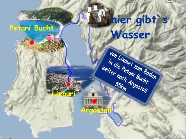 Heute geht’s in die Petani Bucht. Als wir dort ankommen sind wir im ersten Moment etwas enttäuscht, weil die Sonne erst sehr spät kommt und alles noch etwas trostlos aussieht. Aber als die Sonne voll in die Bucht scheint, hat das Wasser wieder diese tollen Farben. Wir laufen (mit einem roten Kater, der sich an unsere Fersen heftet) zum Buchtende um zu sehen, ob sich hier noch etwas geändert hat. Mittlerweile sind einige Badegäste gekommen (Einheimische). Auch wir genießen das herrliche Wasser und ziehen erst gegen Spätnachmittag weiter. Am Fischerhafen in Argostoli (Richtung Leuchtturm) wollen wir übernachten. Dort ist es kurzweilig, wir haben viel zu sehen, aber man begegnet uns sehr unfreundlich, fährt uns fast die Fahrräder vom Heck weg, so dass wir den Platz räumen. In der Nähe des Leuchtturms finden wir einen guten Platz mit Blick auf Lixouri, auf den Platz, wo wir die letzte Nacht verbracht haben.